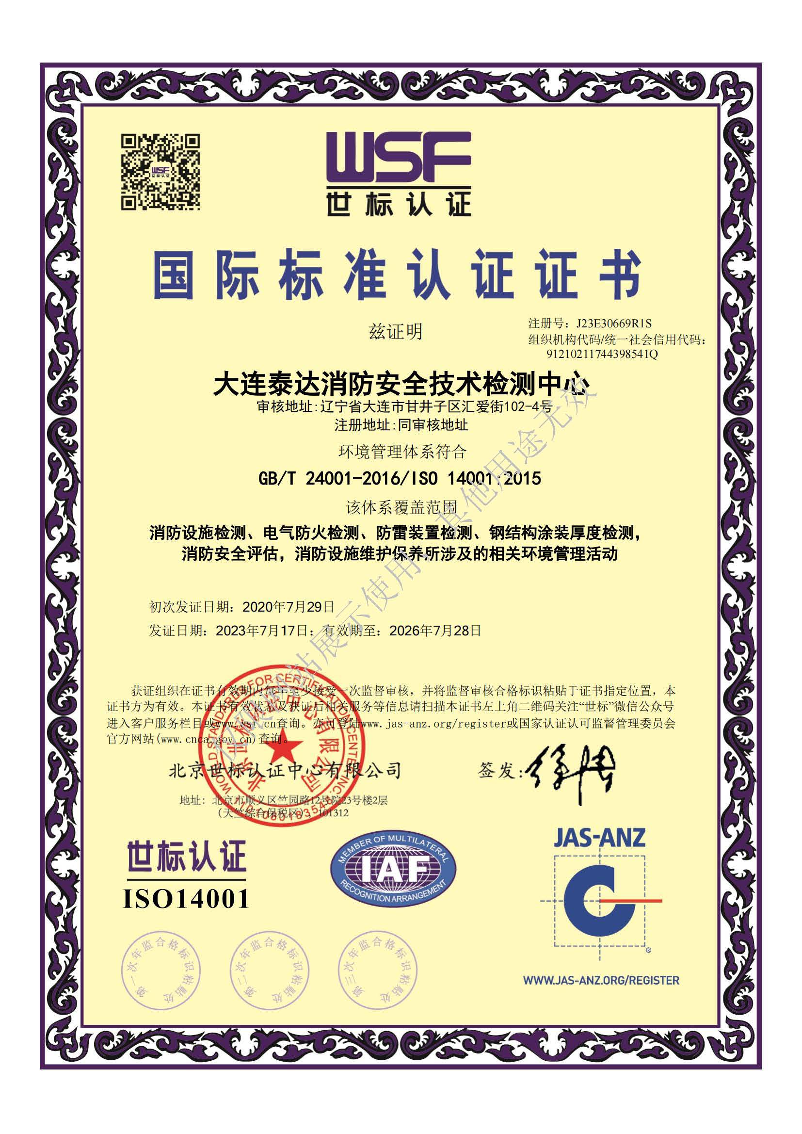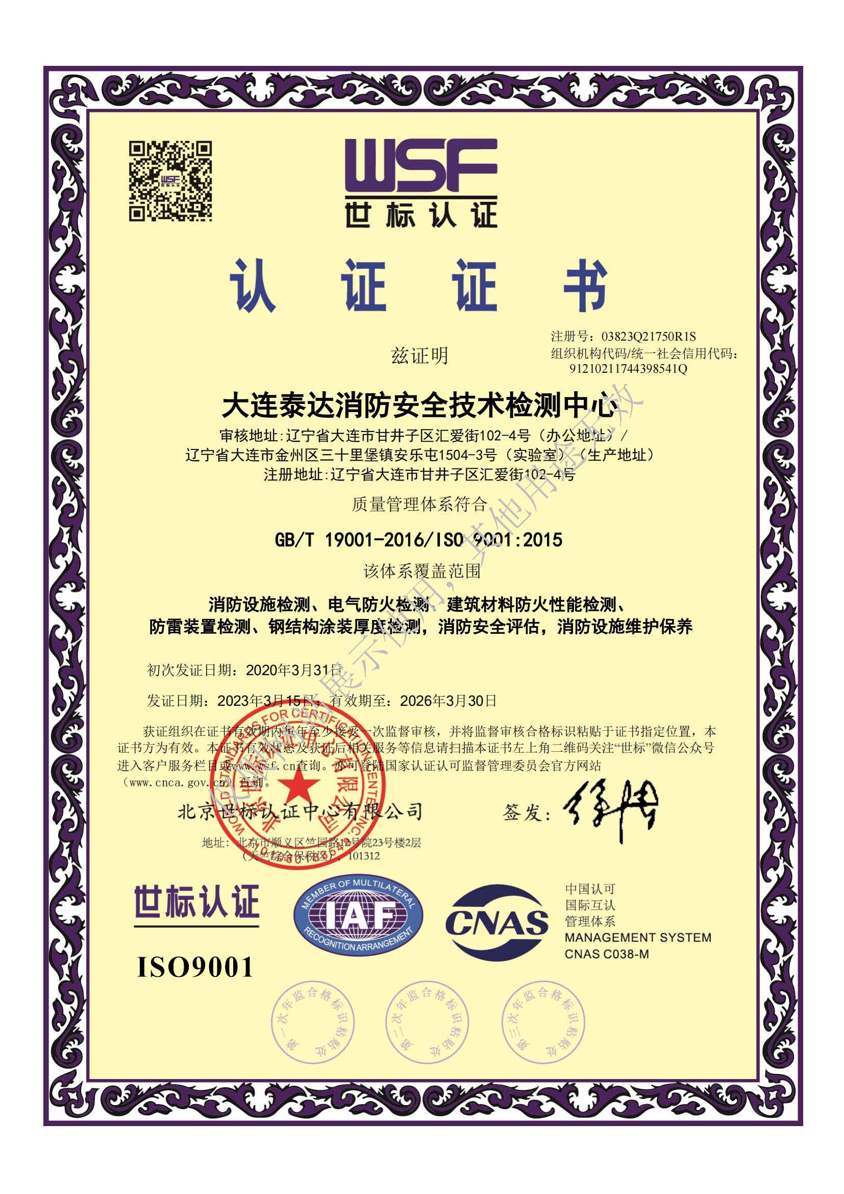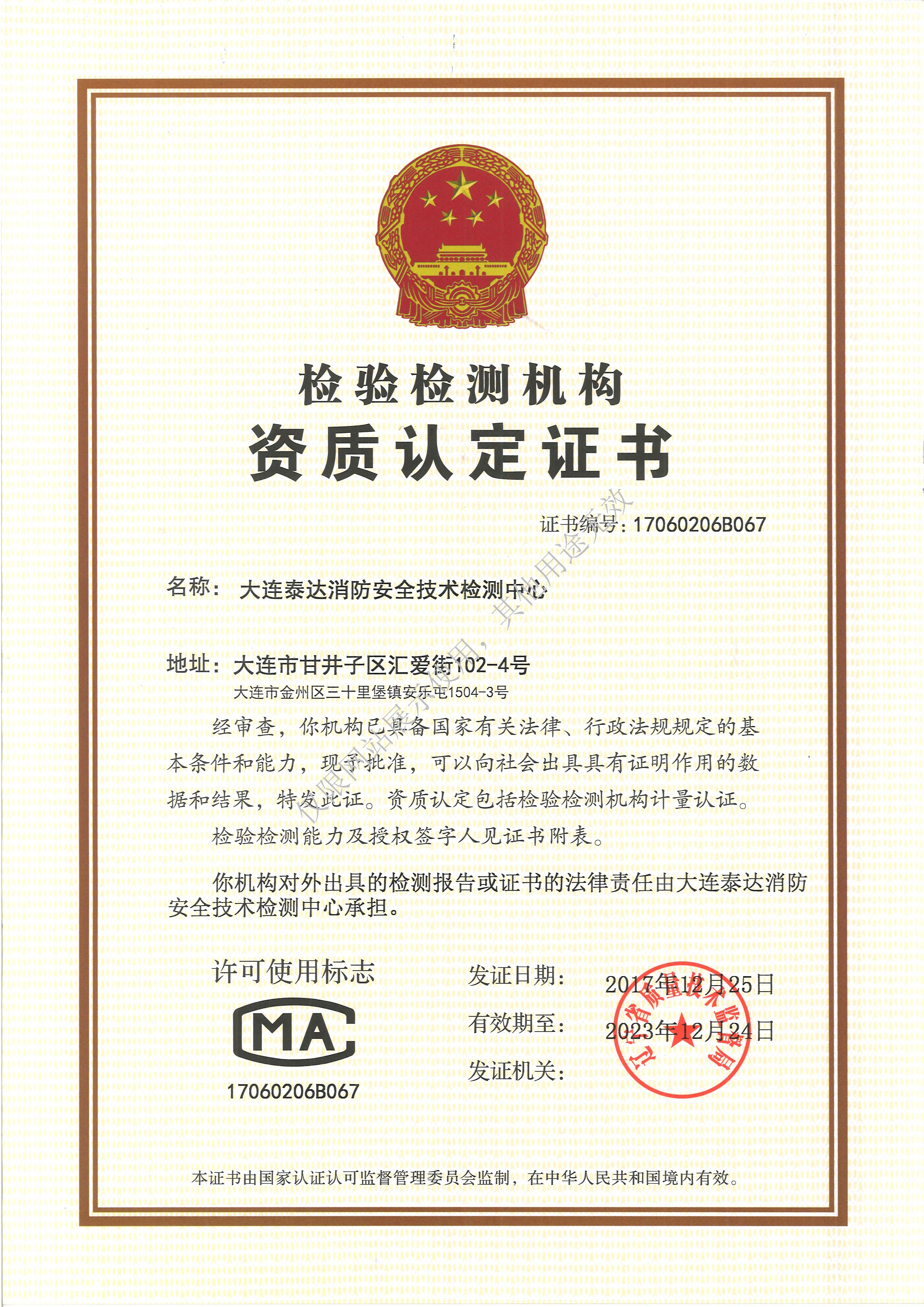 · 是經“社會消防技術服務信息系統”備案并公示的消防技術服務機構,已取得中國氣象局頒發的雷電防護裝置檢測資質證書、遼寧省質量技術監督局審核批準的檢驗檢測機構資質認定證書(CMA)及包括消防檢測、電氣檢測、雷電防護裝置檢測、防火涂層厚度檢測等在內的200余項檢驗檢測能力,取得大連市應急管理局頒發的安全生產標準化證書,獲得質量管理體系、環境管理體系、職業健康安全管理體系認證證書,是經備案的高新技術企業,可獨立出具具有證明作用的檢測報告。